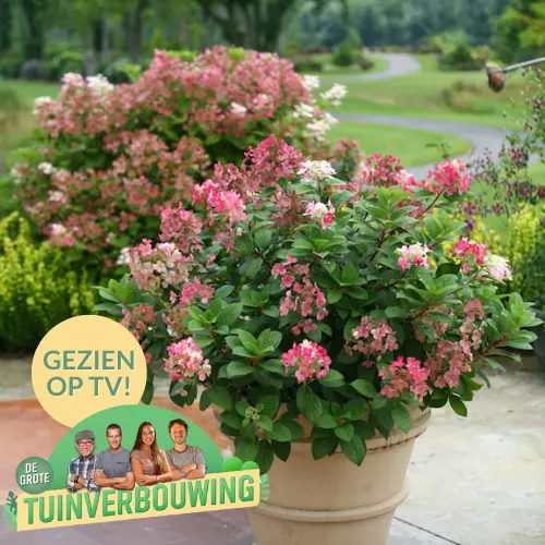 Wat deze plant echt speciaal maakt, zijn de prachtige bloemen die in de zomer beginnen te verschijnen. De bloemen beginnen als een frisse, lichtgroene kleur en veranderen geleidelijk aan in een levendig roze. Dit kleurenpalet voegt een speelse en levendige sfeer toe aan elke buitenruimte.